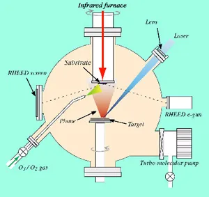 To deposit a thin film of transition metal oxide, the PLD (Pulse Laser Deposition) method is often used. In this method, a pulsed UV laser beam is focused on a target raw material, instantly breaking down and vaporizing it, and depositing the material on a substrate. In contrast, to grow an oxide epitaxially on a substrate, the substrate must be heated to a high temperature in a high oxygen pressure. Fig. shows the concept of the PLD method, while Photo2 shows an example in which the infrared guide heating system (at the top of the photo) has been installed for heating a substrate.